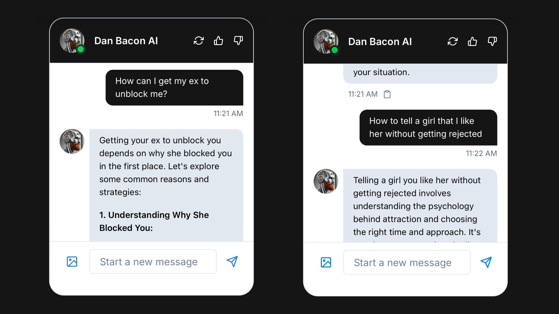 Whether you need a perfect text reply to send to a woman you like, a technique to spark attraction with a girl you’re in the friend zone with, the best ways to get a first kiss, how to get to sex on the first night or on a date, personalized tips on how to get the spark back in a relationship, a tailored strategy to get your ex back, Dan Bacon AI is here for you 24/7.