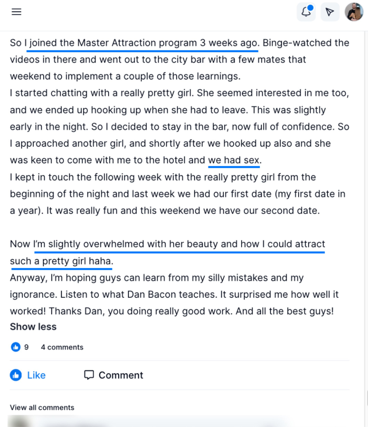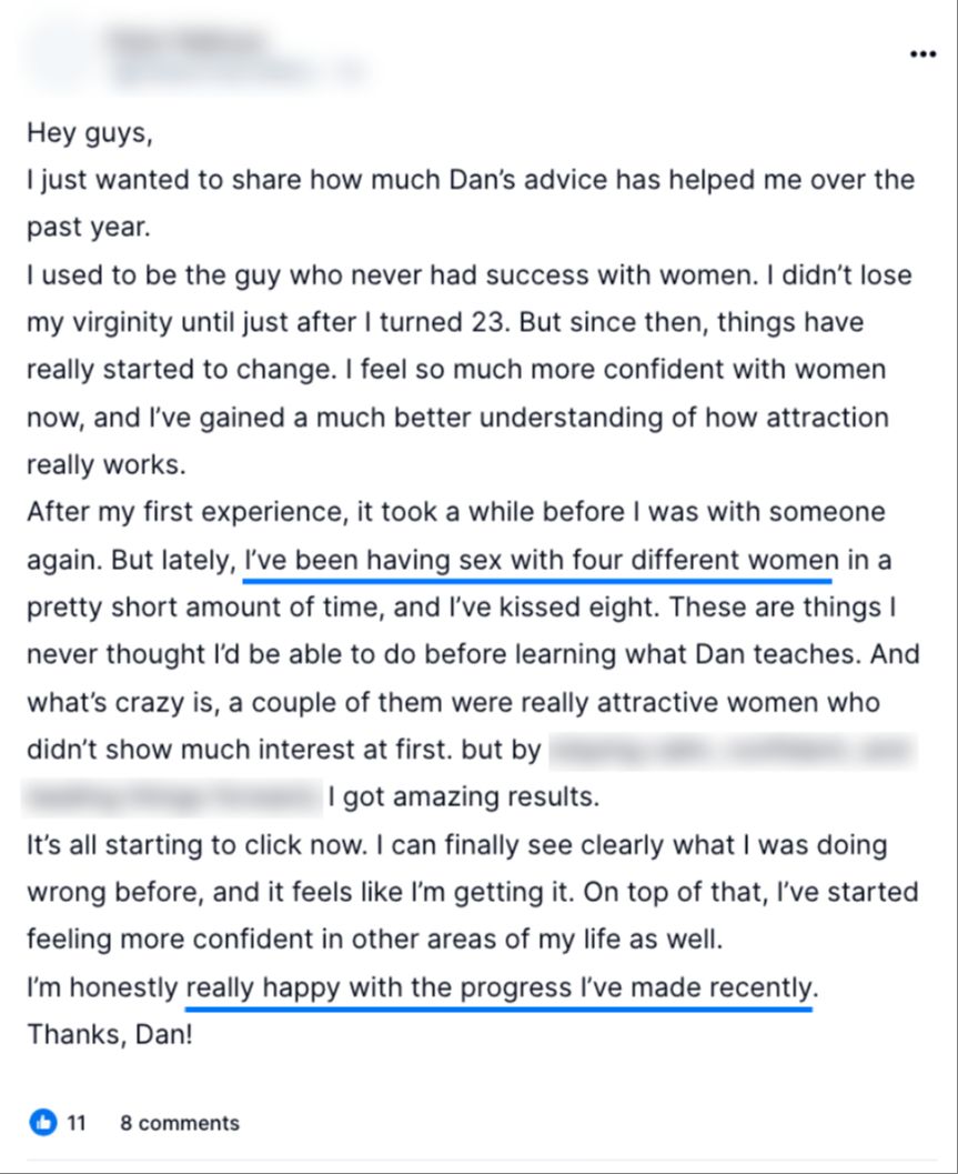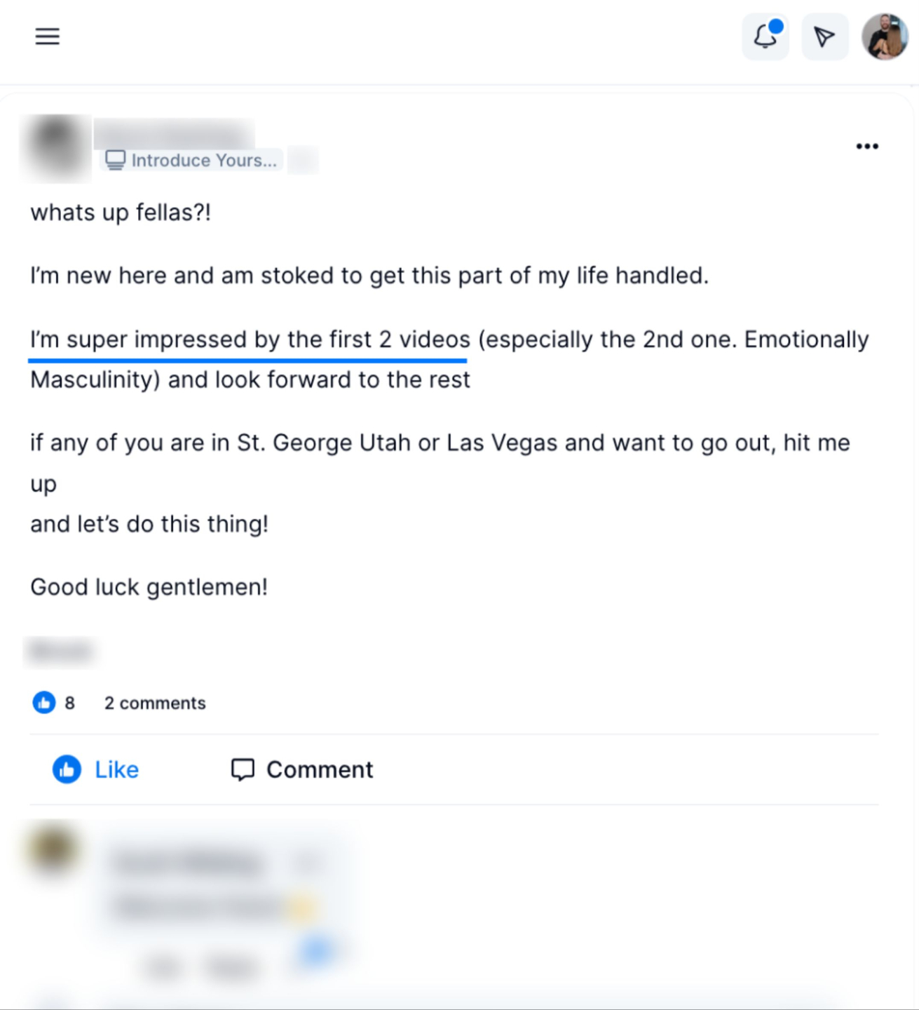 The first two lessons (Confidence and Emotional Masculinity) have allowed members to get kisses, sex, dates and new girlfriends, as well as overcome approach anxiety and feel so much better about themselves overall.