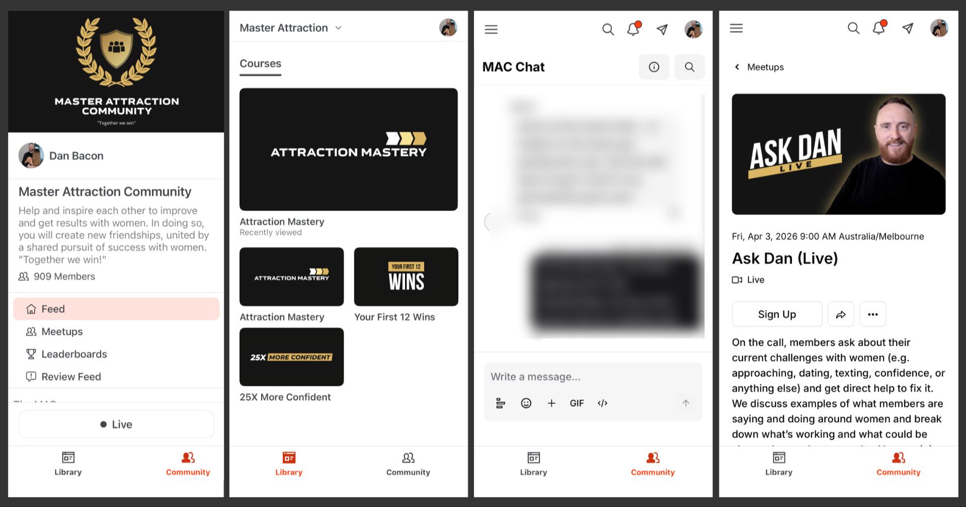 At Master Attraction, you will learn directly from Dan Bacon, be supported by Dan Bacon AI (24/7 support and custom advice available for you) and be supported and inspired by your fellow members who are already experiencing amazing results with women.